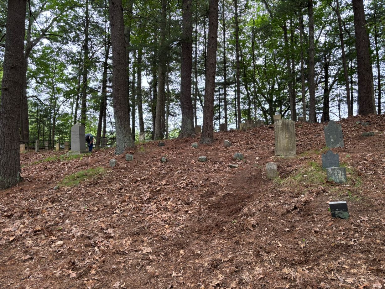 "In back of the second house north from the Mowry Four Corners, in the edge of the woodland and on the east side of the road, on top of hill, there are several lots here, badly neglected most of them."