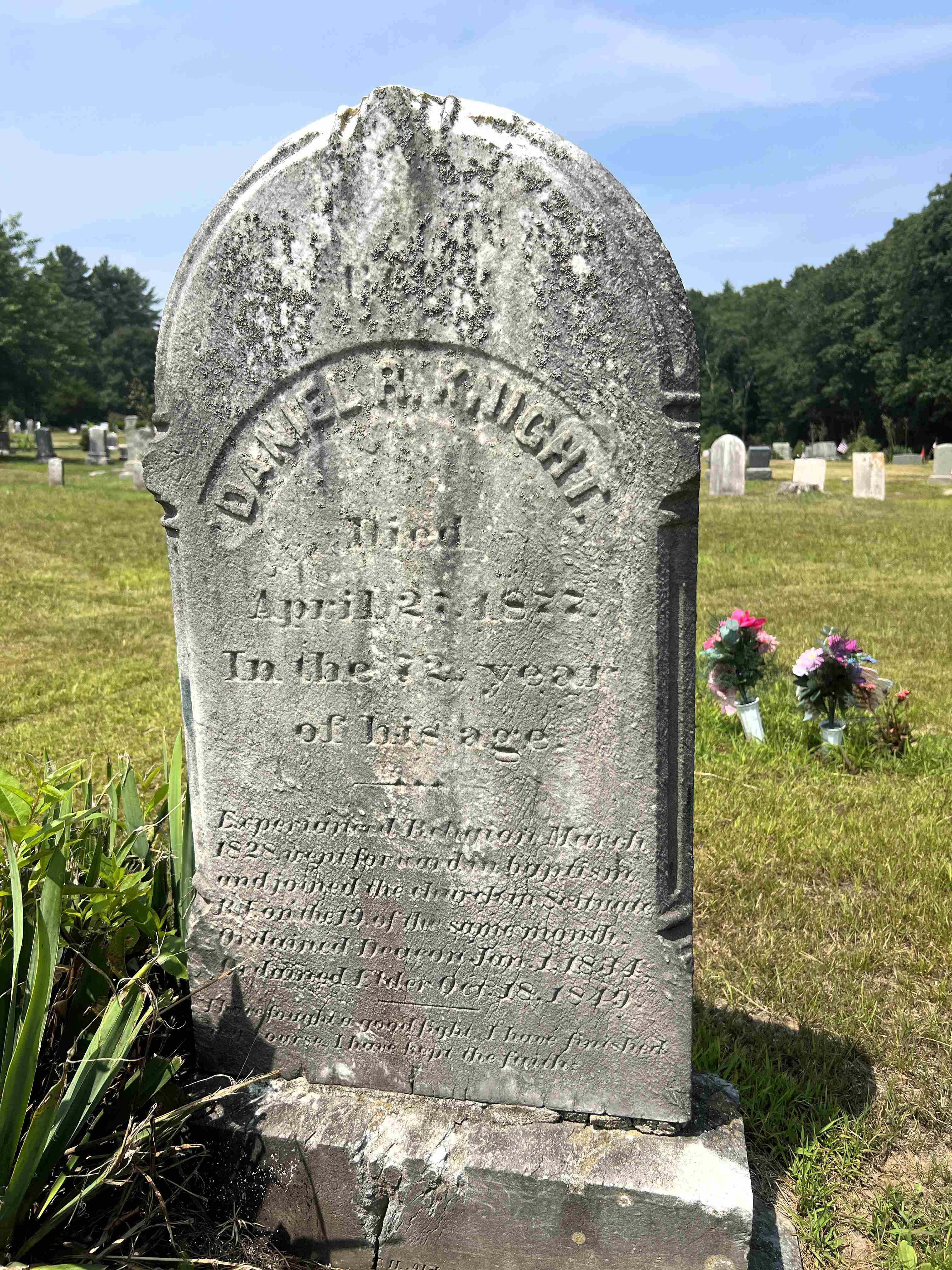 "Experienced religion March 1828, went forward in baptism & joined the church in Scituate, RI on the 19th of the same month. Ordained Deacon January 1, 1834. Ordained Elder Oct 18, 1849." [m2 Mrs Ruth E. Johnson of Exeter, who first married Horace Johnson and was daughter of Jonathan James & Ruth Barber]